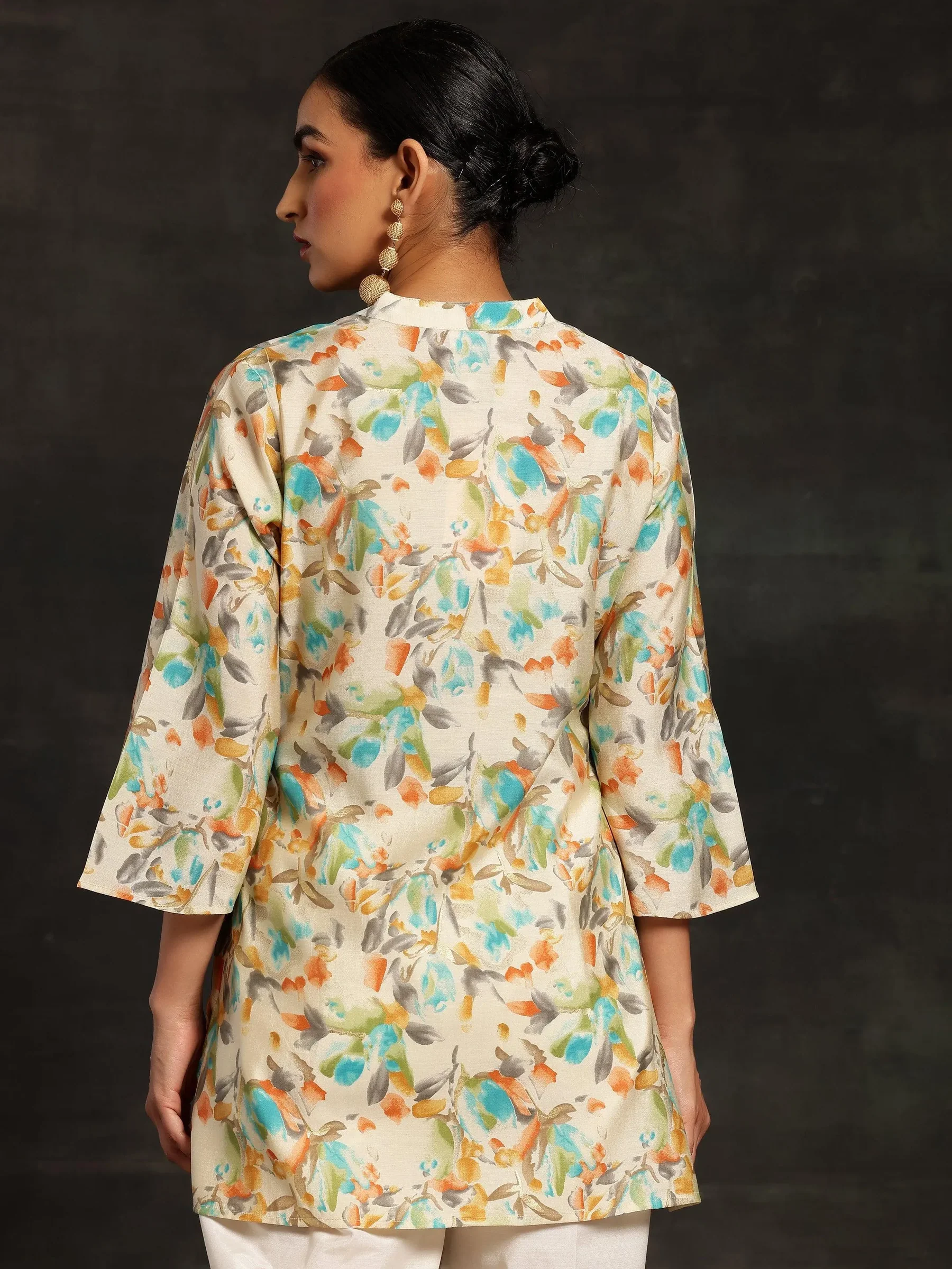 Beige Printed Silk Blend Straight Kurtis