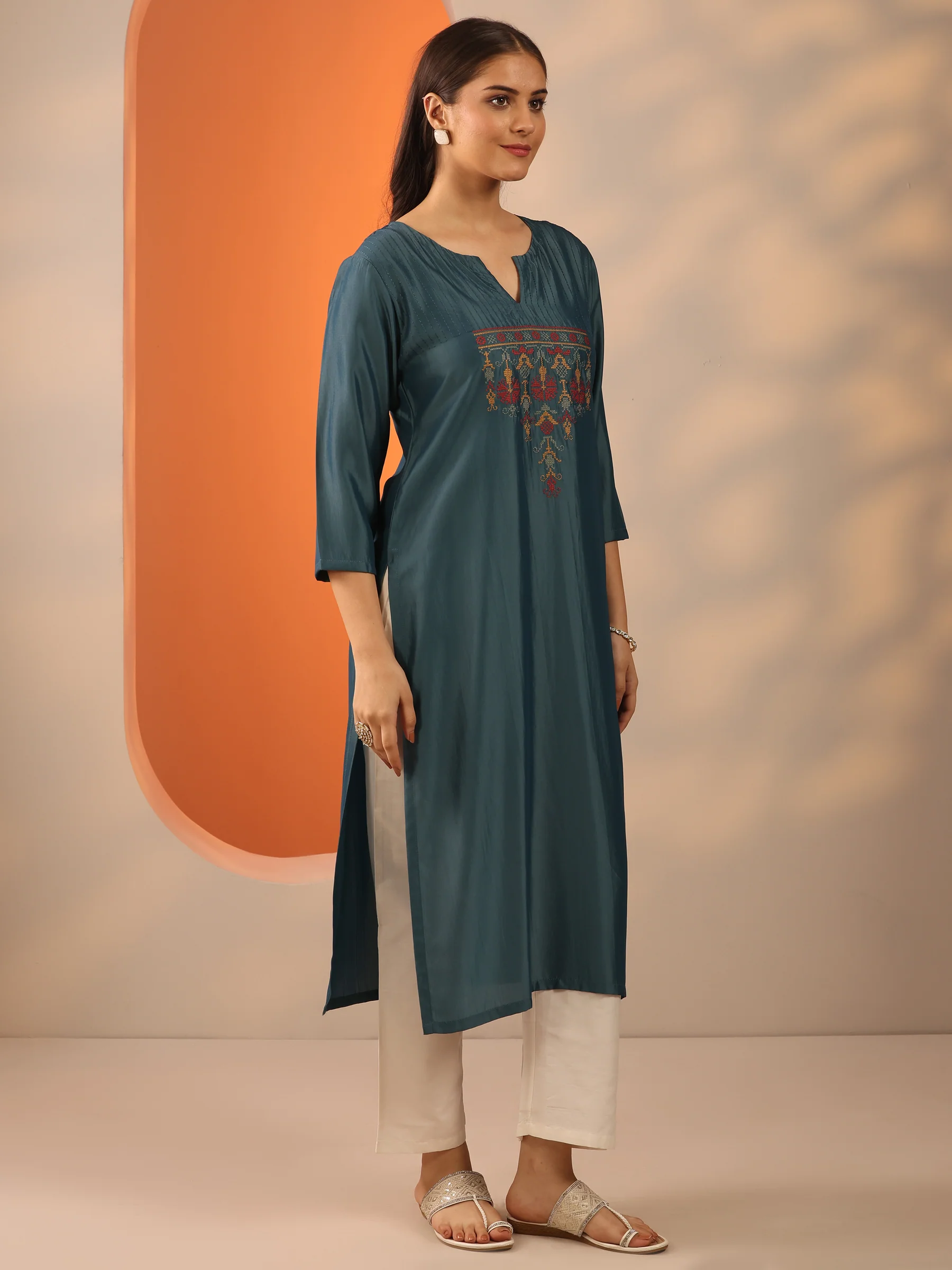 Grey Embroidered Silk Blend Straight Kurta